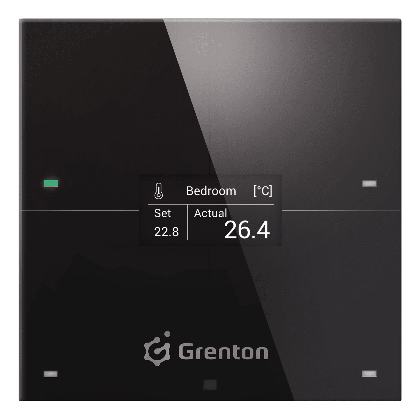 Smart Panel glerrofi með OLED skjá og fjórum snertirofum sem hver um sig getur verið með fjórar aðgerðir.