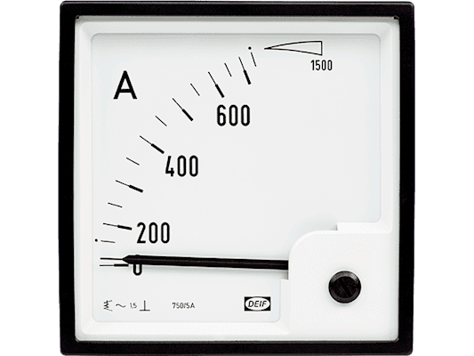 Ampermælir fyrir straumspenna /5 A, með skala. Mælirinn sýnir upp í 2x yfirálag.