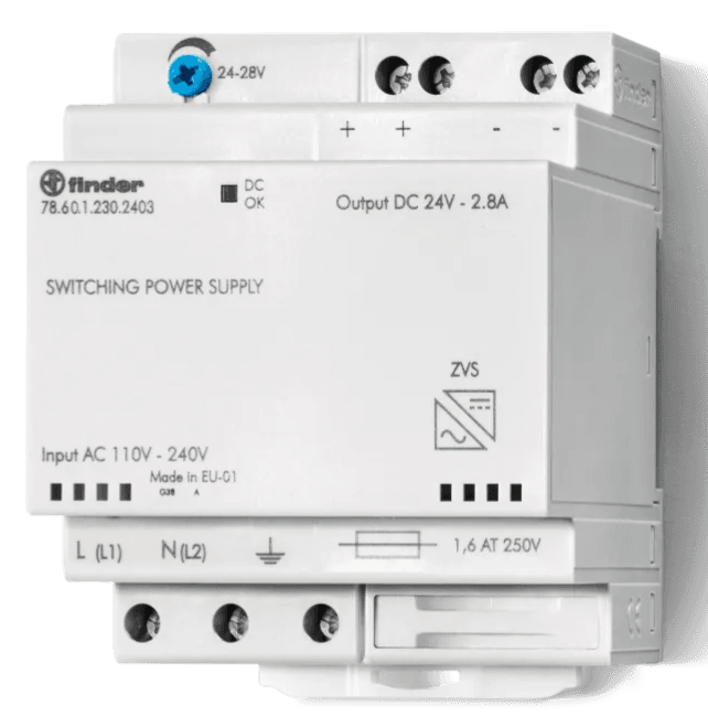 Spennugjafi, 24 V DC, með yfirálags- og skammhlaupsvörn.