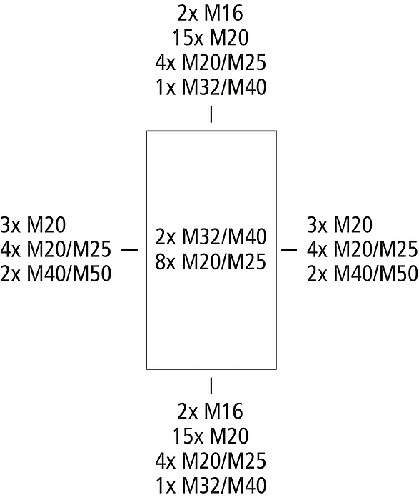 Kapalinntök, ofan/neðan | 2xM16, 15xM20, 4xM20/M25, 1xM32/M40 |