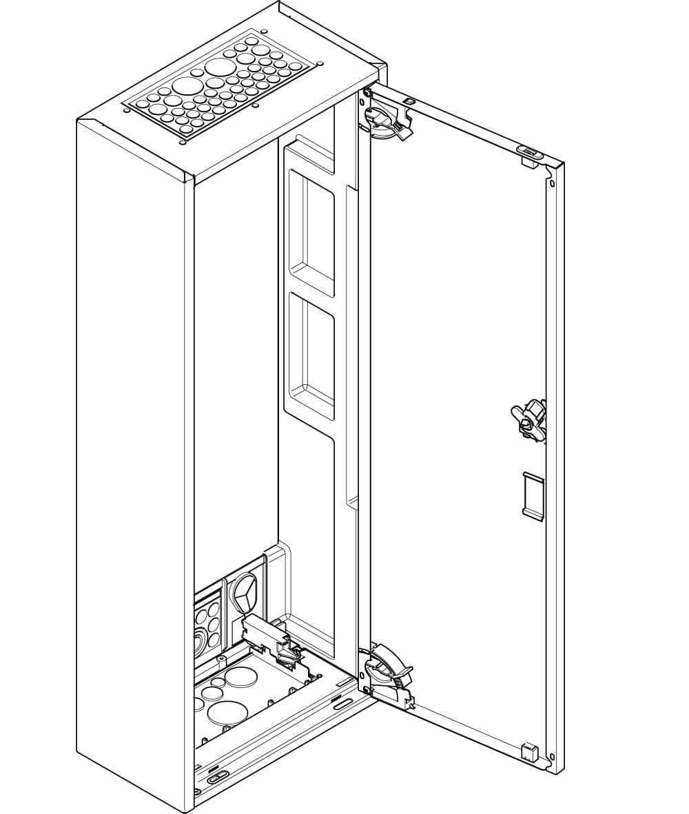 Tómur skápur með festingum fyrir prófíla (stoðir) og mjúka flangsa fyrir strengi.