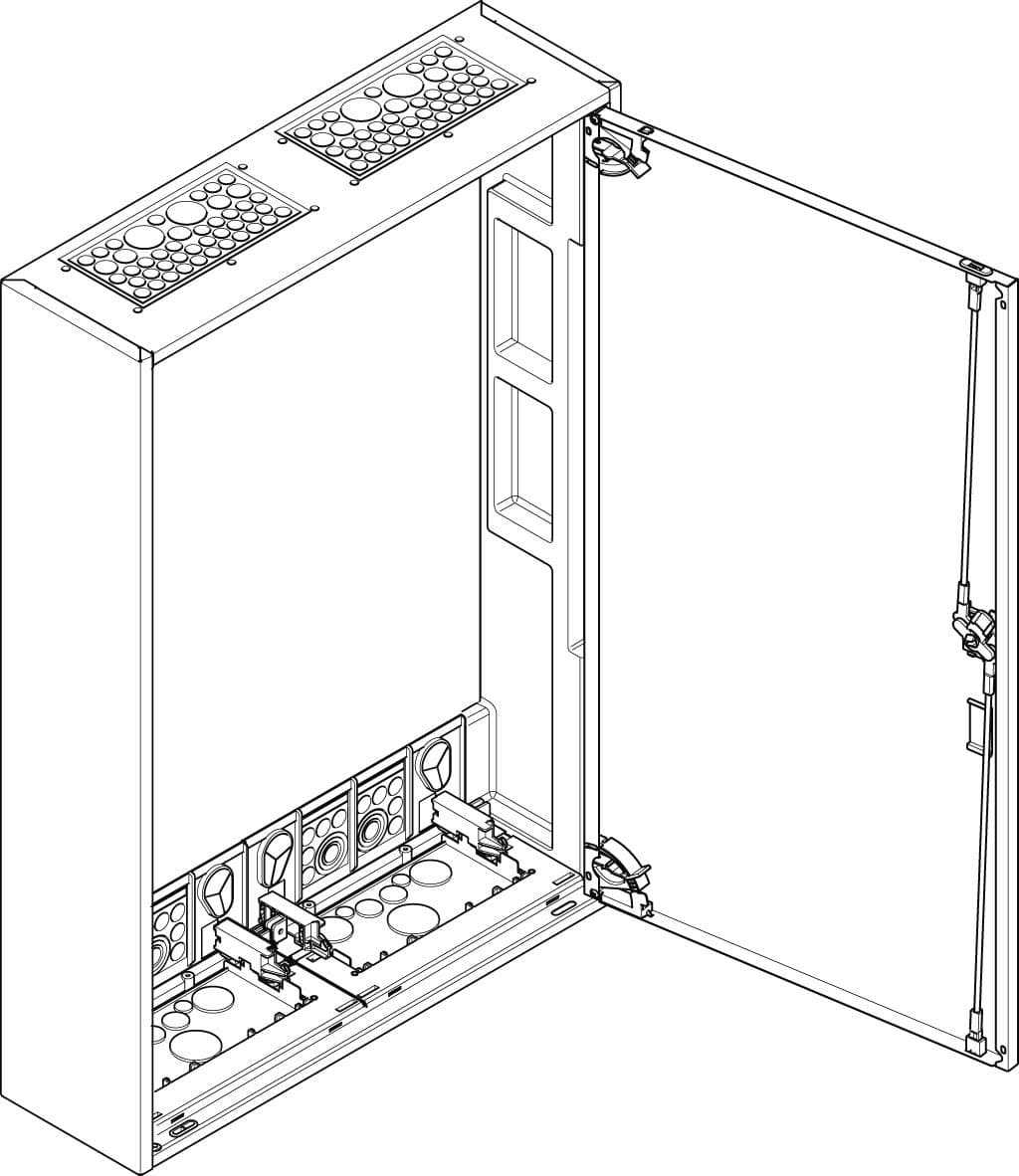 Tómur skápur með festingum fyrir prófíla (stoðir) og mjúka flangsa fyrir strengi.