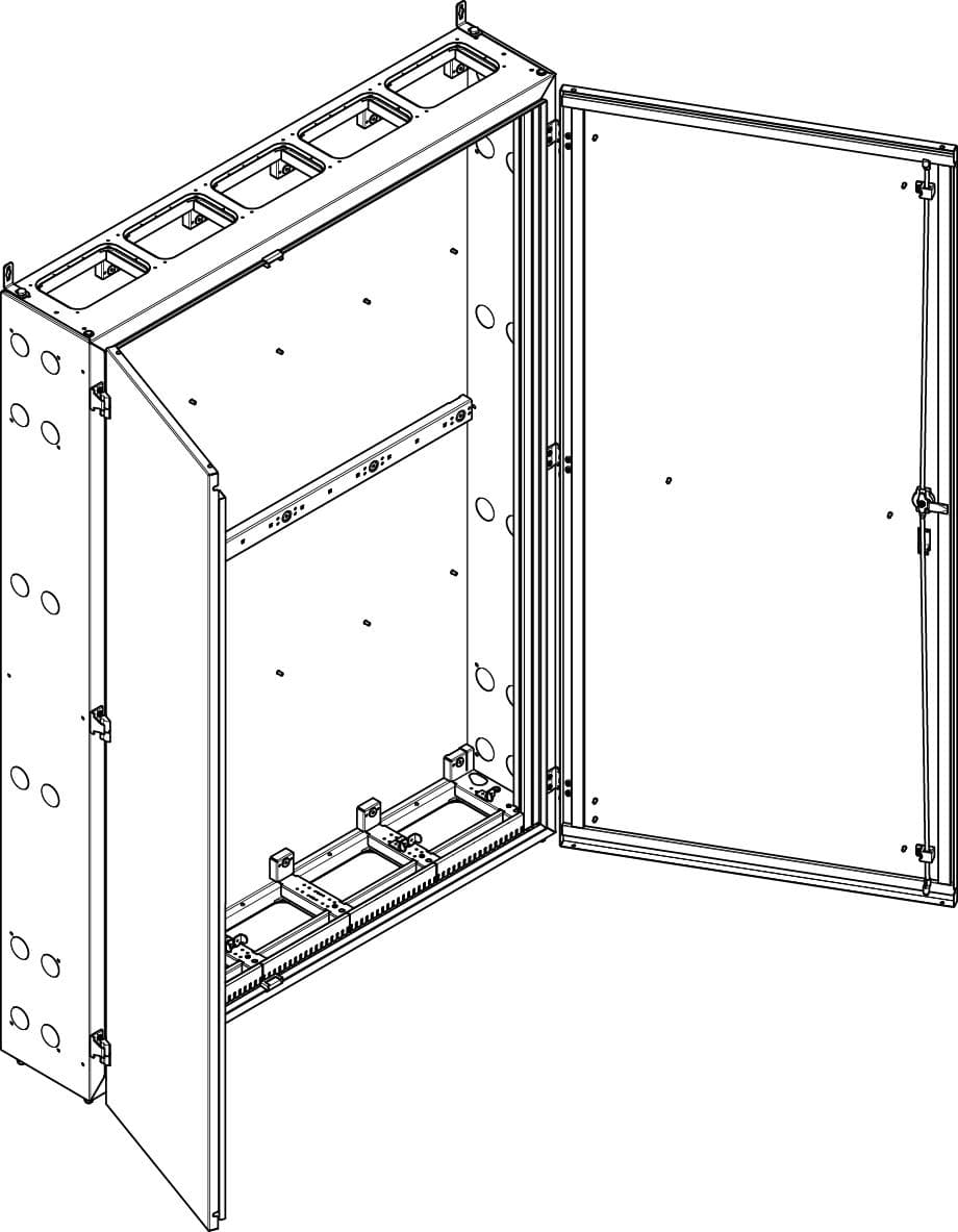 Tómur skápur með festingum fyrir sex prófíla (stoðir) og veggfestivinklum. Skápurinn er án sökkuls og gaflplatna (flangsa).