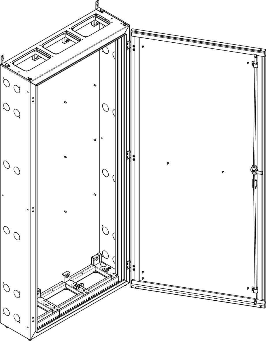 Tómur skápur með festingum fyrir fjóra prófíla (stoðir) og veggfestivinklum. Skápurinn er án sökkuls og gaflplatna (flangsa).