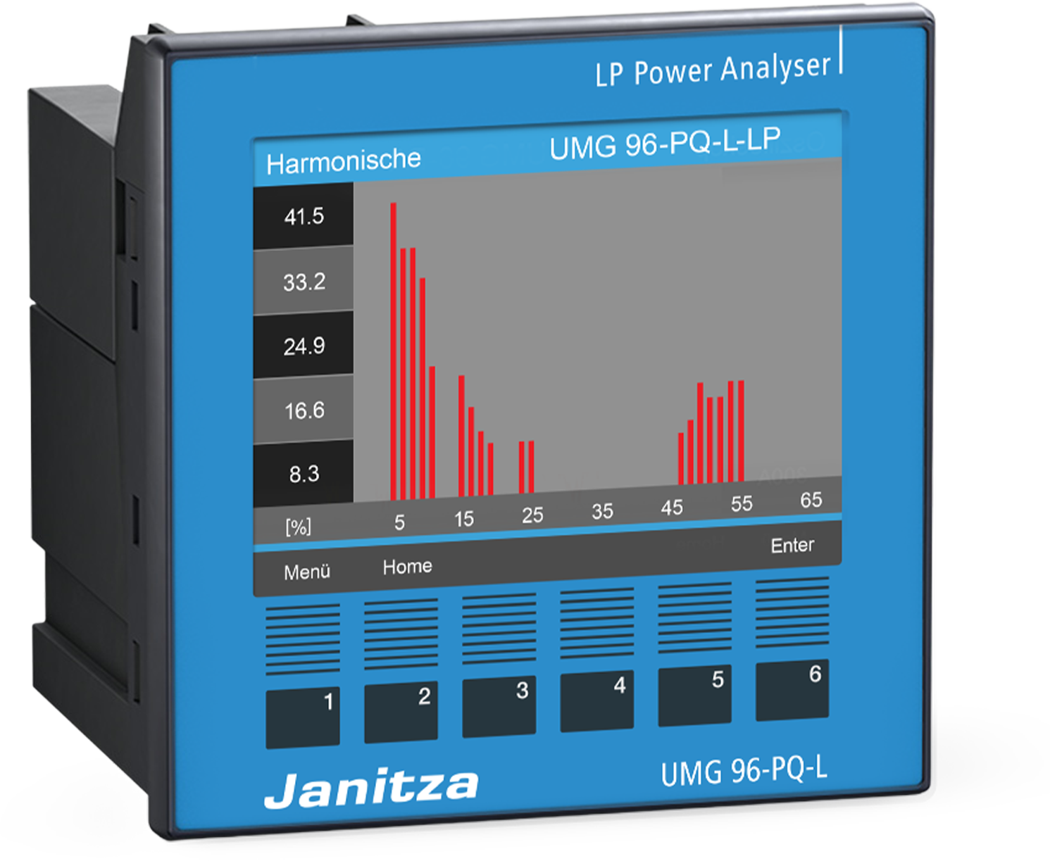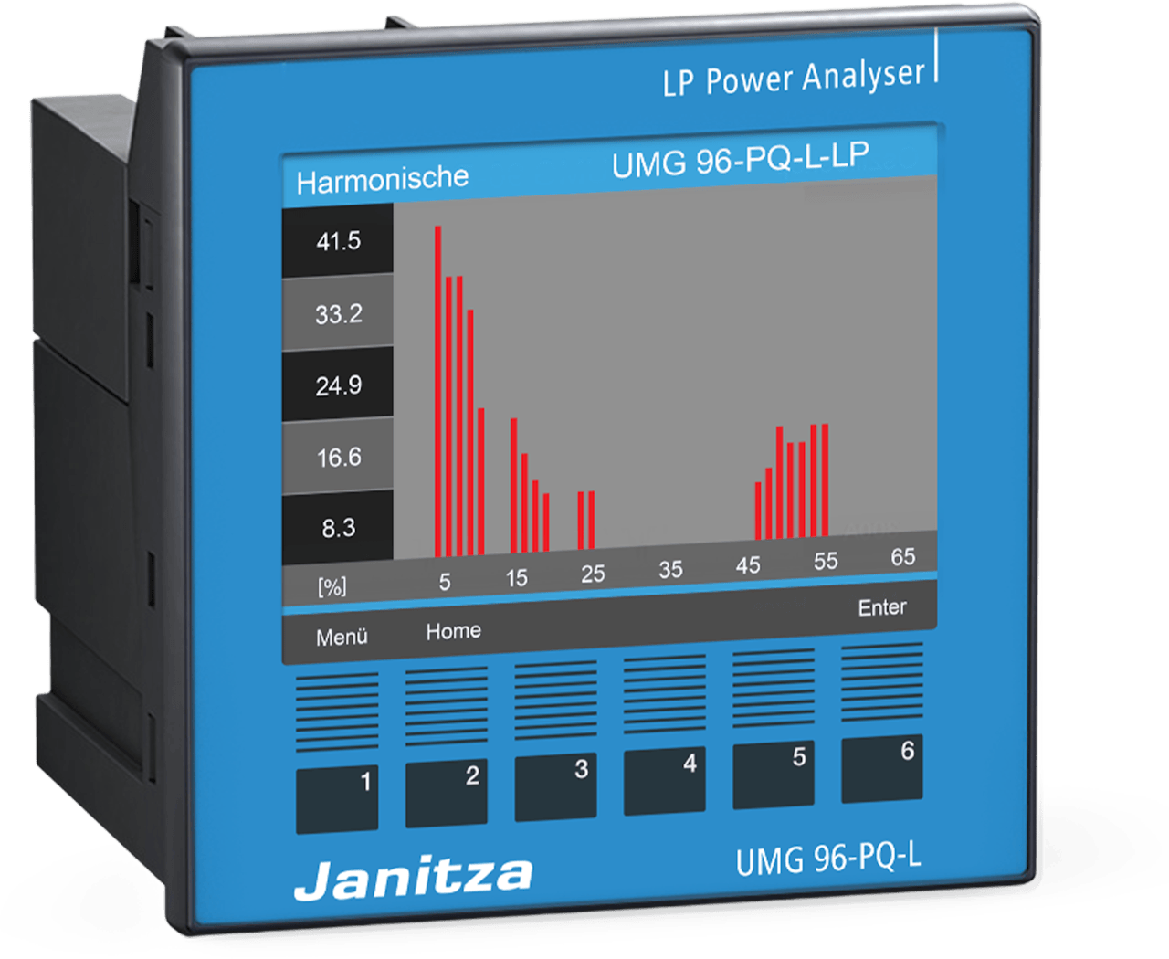 Tækið er búið grafískum skjá sem sýnir mæligildi, orkugæði og atburði. Með 280 punkta mælingu á bylgju og atburðaskráningu niður í 1 ms greinir UMG 96-PQ-L-LP truflanir á hraða og spennusveiflur af mikilli nákvæmni.