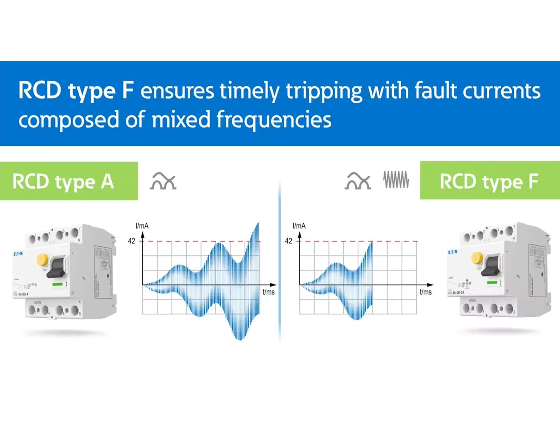 Lekaliðavörn Type-F veitir betri vernd með því að greina bilunarstrauma með yfirtíðnum allt að 1kHz. Hún tryggir öruggt rof og minnkar líkur á ónauðsynlegu rafmagnsrofi. Type-F er einnig minna viðkvæm fyrir innri spennuvörn orkusparandi tækja.